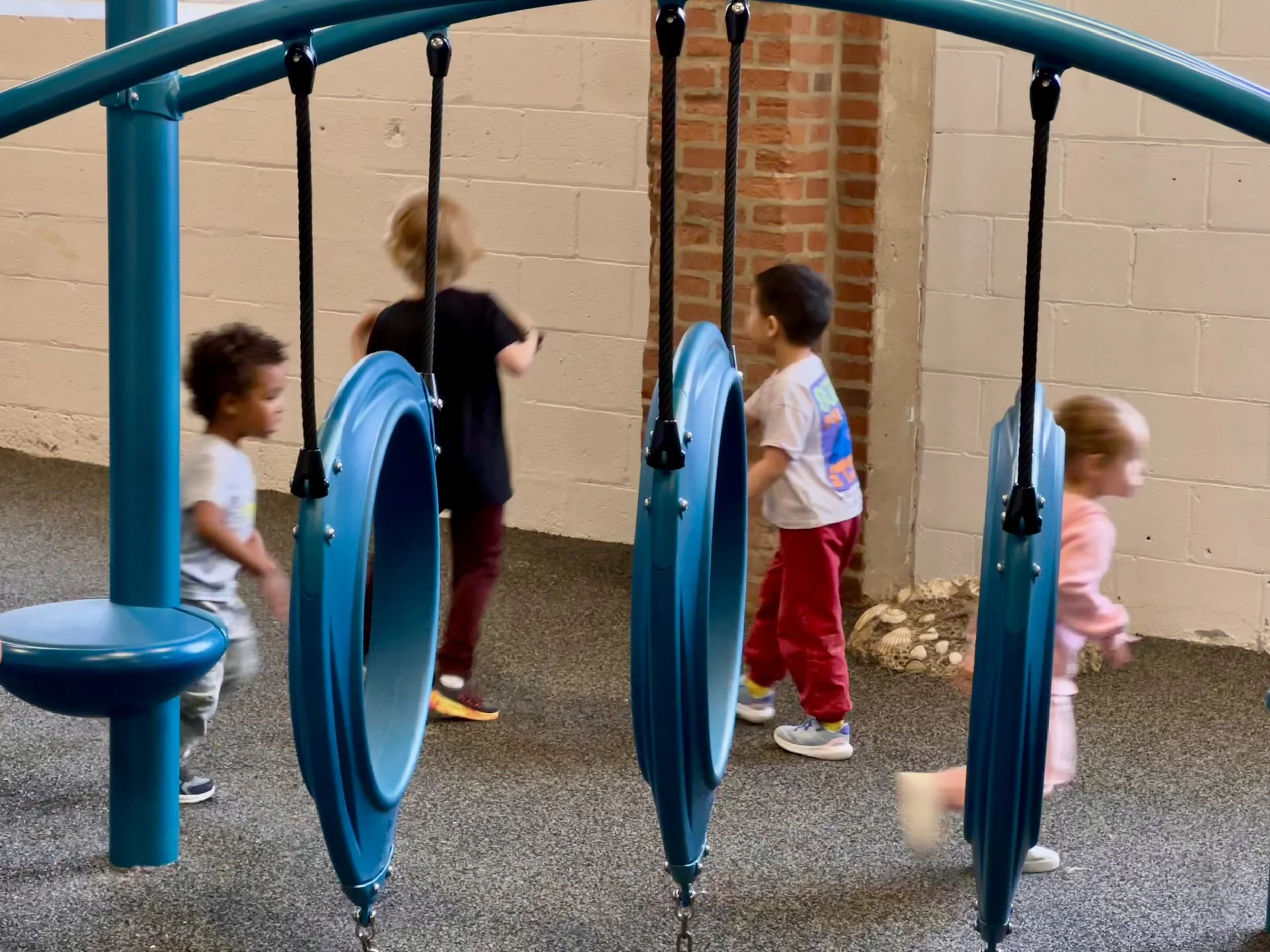 Children playing near blue playground equipment inside a building with a brick and concrete wall.